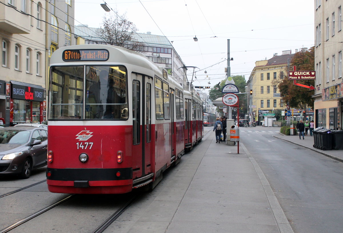 Wien Wiener Linien SL 67 (c5 1477 + E2 4077) X, Favoriten, Quellenstraße (Hst. Quellenplatz) am 17. Oktober 2016.