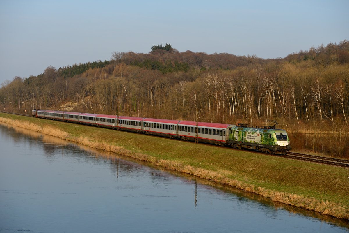 Auch hier wurde noch eine seitlichere Aufnahme mit weniger Brennweite angefertigt: Der stark verspätete EC 112 am Donauufer bei Günzburg, in "Sandwich-Bespannung" mit den Werbe-Tauri 1016.023 und 1116.153 (09. April 2015).