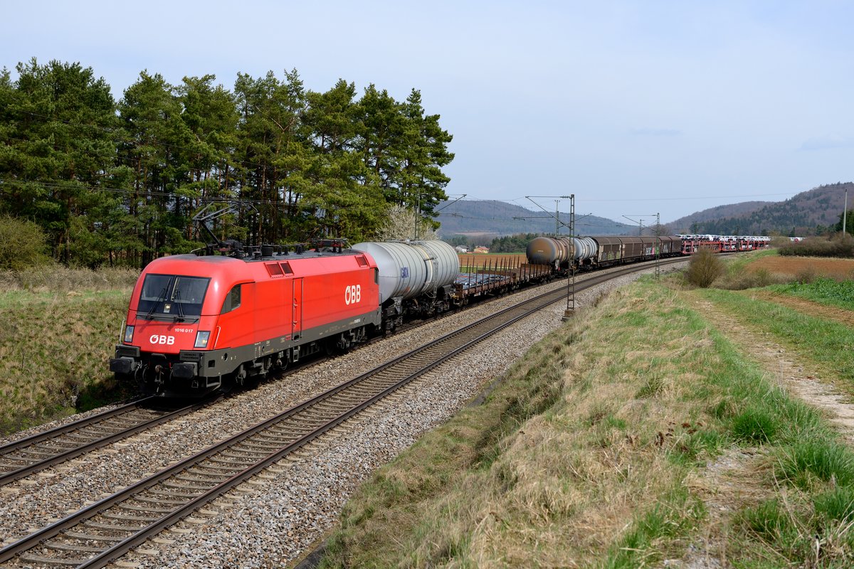 1016.017 konnte am 16. April 2015 mit einem gemischten Güterzug nach Nürnberg Rbf bei Darshofen in der Oberpfalz abgelichtet werden. Leider verschlechterte sich gegen Mittag das Wetter und dieses Bild war dann das letzte dieses Tages.