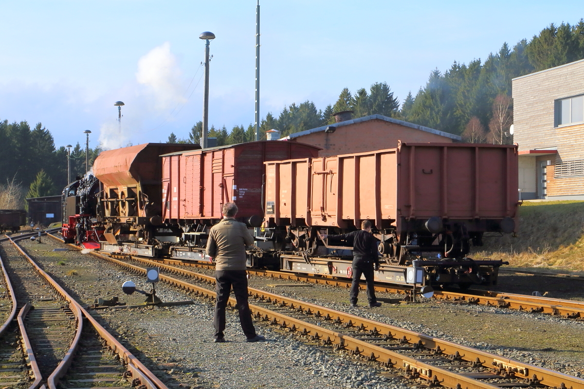 Nachdem 99 222 am 06.02.2016 ihren HSB-Fotogüterzug aus der zwischenzeitlichen Abstellung im Bahnhof Benneckenstein gezogen hat, drückt sie ihn nun in das Nachbargleis, wo der Begleitwagen des Zuges bereits wartet. Dieser wird daraufhin angekuppelt und der Zug ist bereit zur Rückfahrt nach Wernigerode. Das Ganze erfolgt im Rahmen einer Sonderzugveranstaltung der IG HSB.