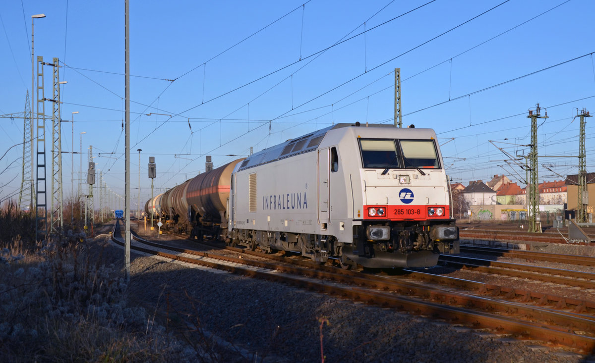 Am 05.12.16 wartet 285 103 der Infra Leuna mit ihrer Übergabe nach Großkorbetha auf die Abfahrt Richtung Halle(S).