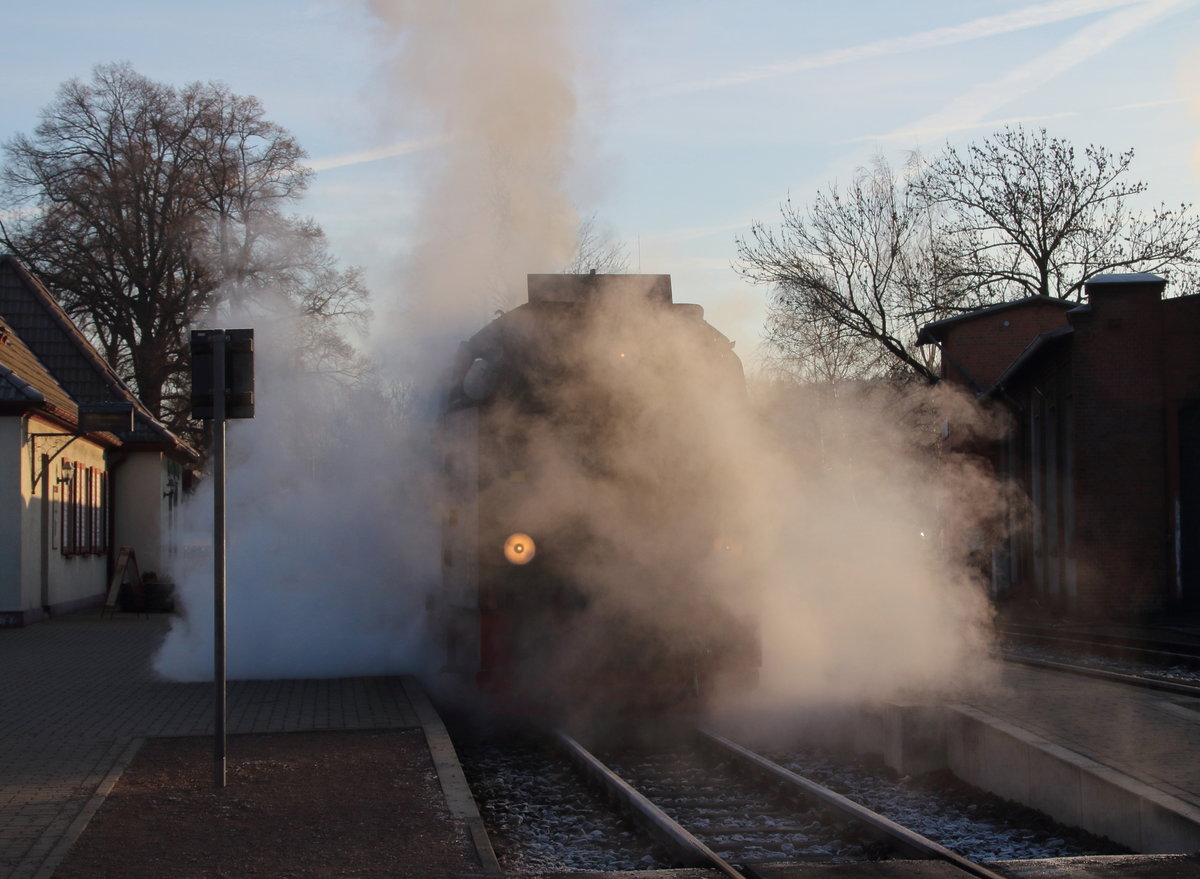 Im eigenen Dampf versteckt steht 99 7234-1 mit dem P8960 (Harzgerode - Quedlinburg) und wartet auf die Abfahrt.