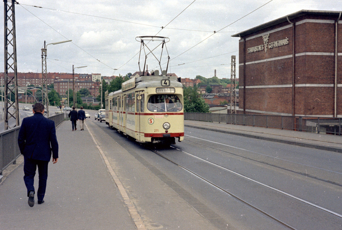 Kiel KVAG SL 4 (DÜWAG-GT4 271) am Städtischen Gefrierhaus am 9. Juni 1968. - Scan von einem Farbnegativ. Film: Kodacolor X.