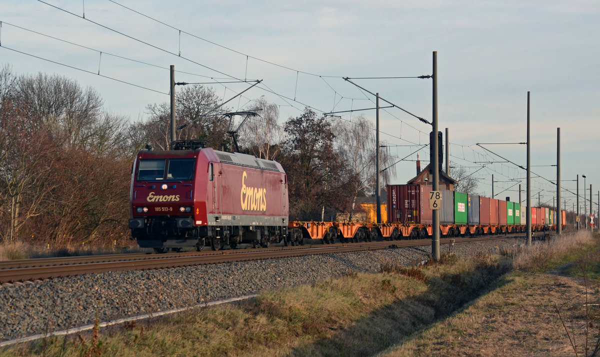 185 513 führte am 08.12.16 einen kurzen Containerzug durch Braschwitz Richtung Halle(S). Gruß zurück!