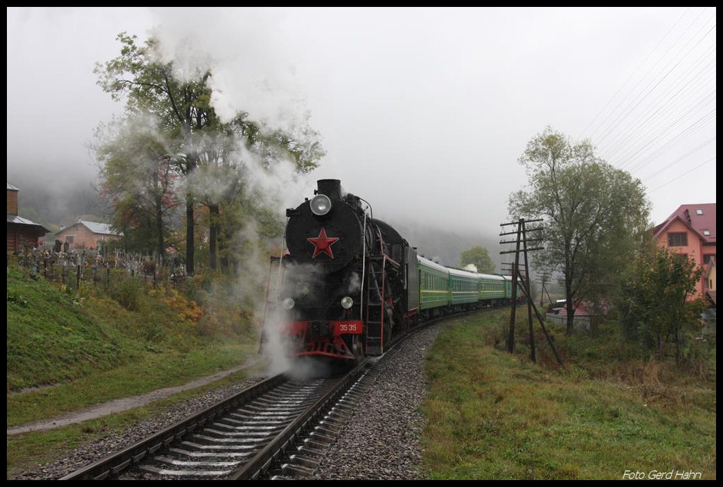 Bei strömendem Regen fuhr am 13.10.2016 L 3535 mit ihrem Sonderzug nach Rachiv im Bahnhof Deljatin aus.