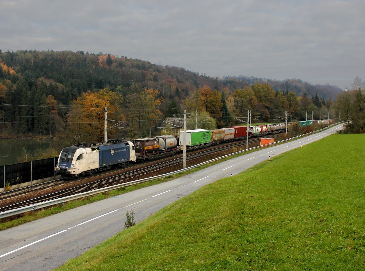 Die ES 64 U2-068 mit einem KLV-Zug am 13.11.2016 unterwegs bei Wernstein.