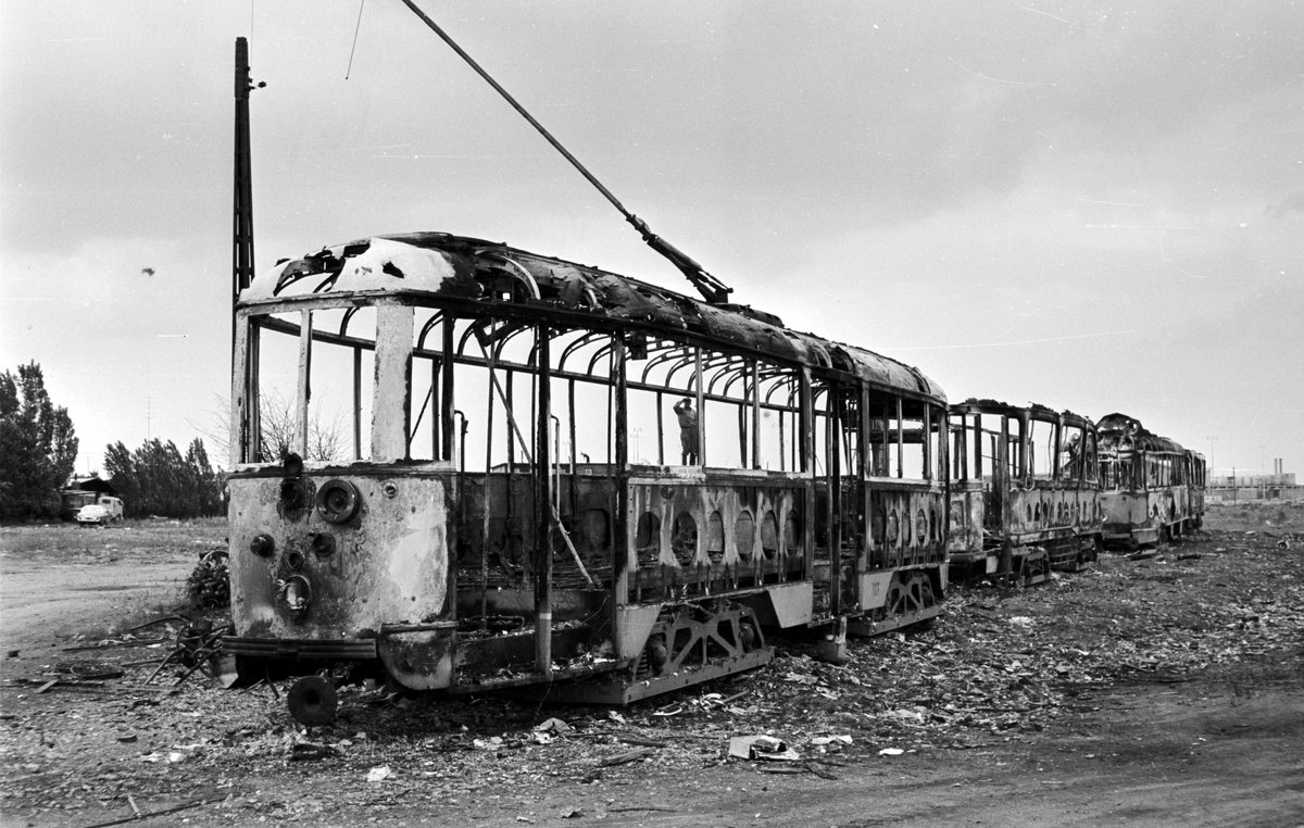 København / Kopenhagen Københavns Sporveje (KS): Auf dem Verschrottungsplatz der KS im Kopenhagener Südhafen wurden im Juni 1968 diese Straßenbahnen während der Verschrottung fotografiert. Der Tw im Vordergrund gehörte der Serie 701 - 708; die Triebwagen dieser Serie  wurden in den Jahren 1949 - 1952 von der Hauptwerkstätte der KS hergestellt. Wegen vieler technischer Probleme wurden die acht Triebwagen schon Anfang 1967 ausgemustert. - Der Tw 701 befindet sich heute in der Sammlung des Dänischen Straßenbahnmuseums (Sporvejsmuseet Skjoldenæshom). - Scan von einem S/W-Negativ. Film: Ilford FP3.