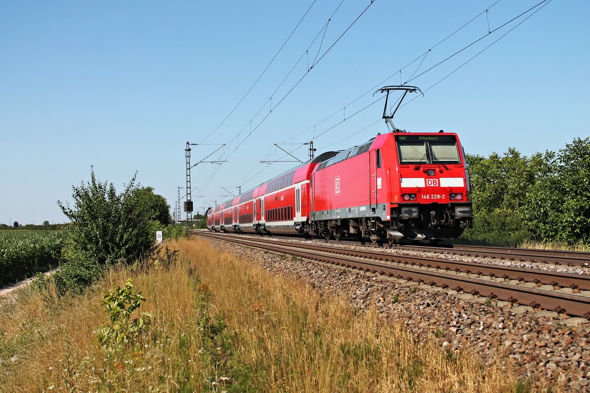 Mit einem KLV kam am 10.07.2015 die Re 482 026-2 bei Hügelheim vorbei und wird in Kürze den Bahnhof von Müllheim (Baden) in Richtung Süden durchfahren.