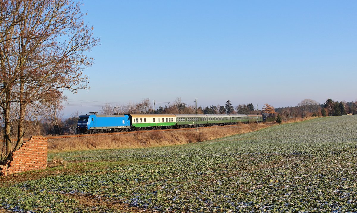 Aufgrund der vielen Triebwagenausfälle bei der MRB, fuhr die Press 145 030 einen Ersatzzug. Hier RE 26983 am 06.12.16 an der Schöpsdrehe bei Plauen/V.