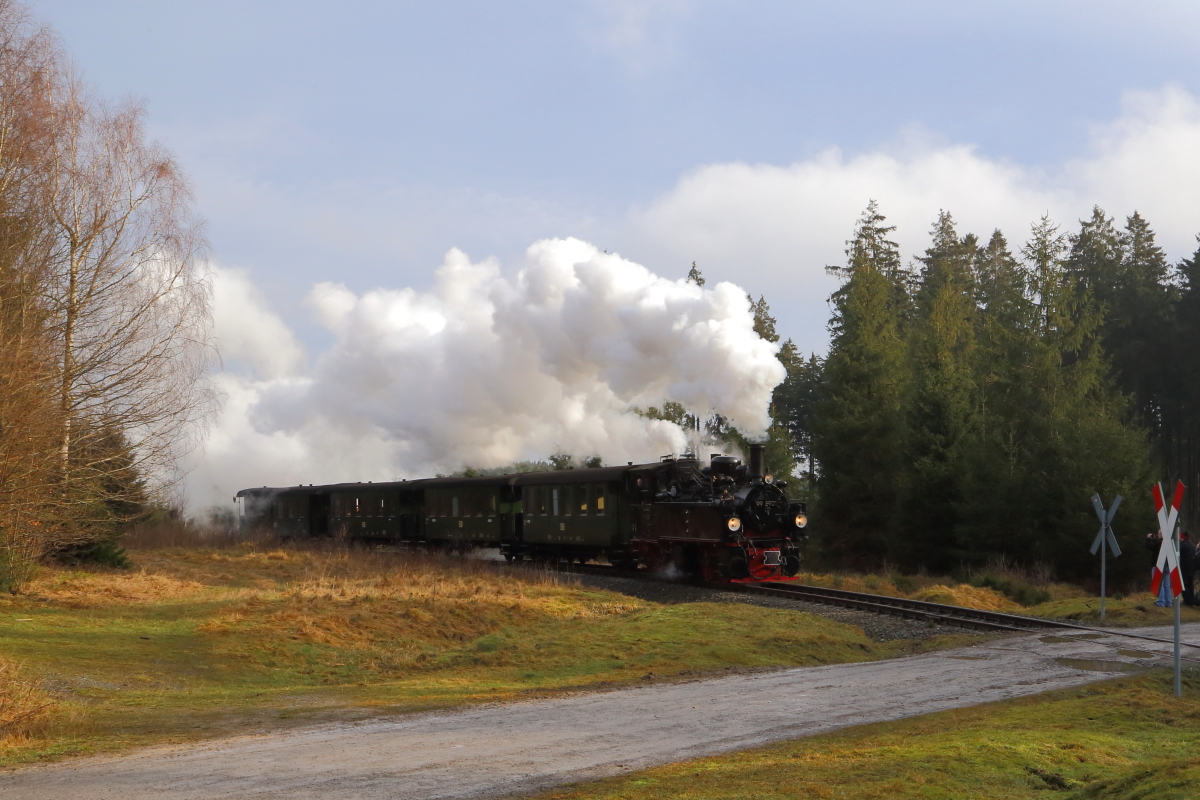 Vorbeifahrt von 99 5901 mit IG HSB-Sonderzug 1 am 06.02.2016 am Bahnübergang Alte Heerstraße, zwischen Drei Annen Hohne und Elend (Km 42,9). Nach erfolgter Vorbeifahrt wird der Zug zurückgedrückt, um die Fotografen wieder aufzunehmen. Dann geht es weiter nach Elend, wo Sonderzug 2 und der Fotogüterzug überholt werden und daraufhin nach Sorge, zum nächsten vorgesehenen Fototermin.