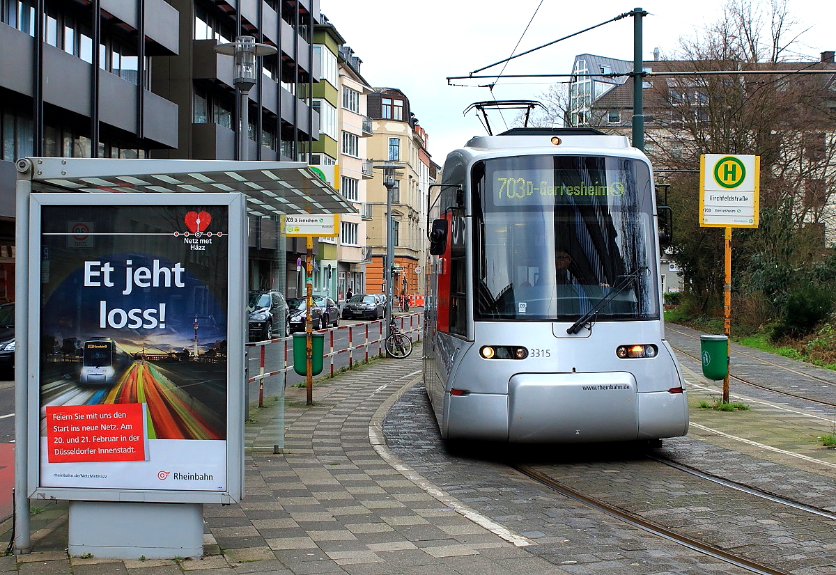 An der Endhaltestelle Kirchfeldstraße wartet der NF8U 3315 am 12.02.2016 auf die Abfahrt in Richtung Gerresheim. Das Plakat an der Wartehalle wirbt mit dem Spruch "Et jeht loss" für das "Netz met Häzz" (auf hochdeutsch "Es geht los" bzw. "Netz mit Herz"), das am kommenden Wochenende auch diese Wendeschleife überflüssig machen wird.