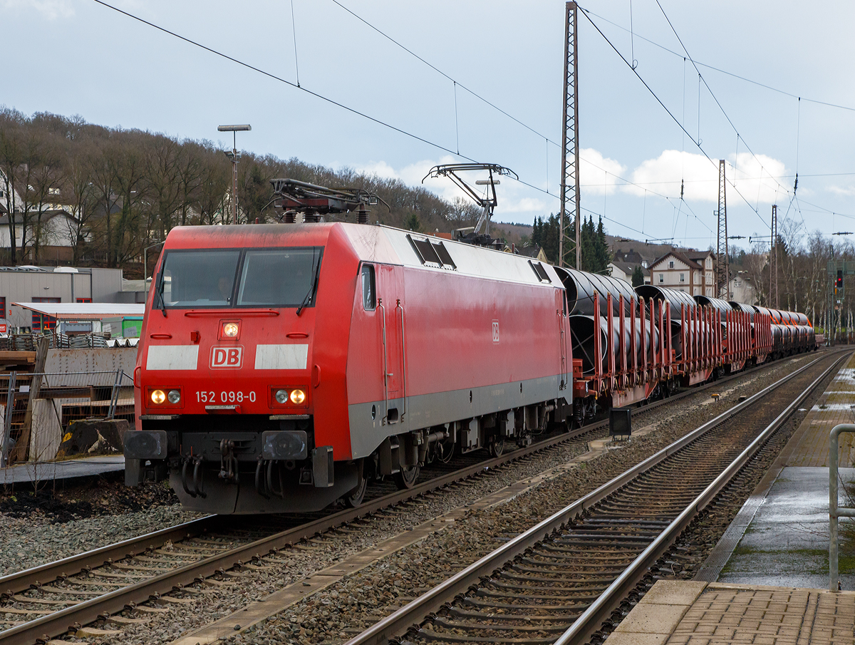 Die 152 098-0 (91 80 6152 098-0 D-DB) der DB Schenker Rail Deutschland AG fährt am 08.02.2016 mit einem Großohre beladenen Güterzug, durch dem Bahnhof Kreuztal in Richtung Hagen. Den Güterzug hatte sie kurz zuvor im Rangierbahnhof Kreuztal übernommen.