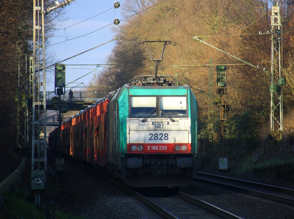 Die Cobra 2828 kommt die Kohlscheider-Rampe hoch aus Richtung Neuss,Herzogenrath mit einem langen Toyota-Autozug aus Gliwice(PL) nach Zeebrugge(B) und fährt durch Kohlscheid in Richtung Richterich,Laurensberg,Aachen-West.