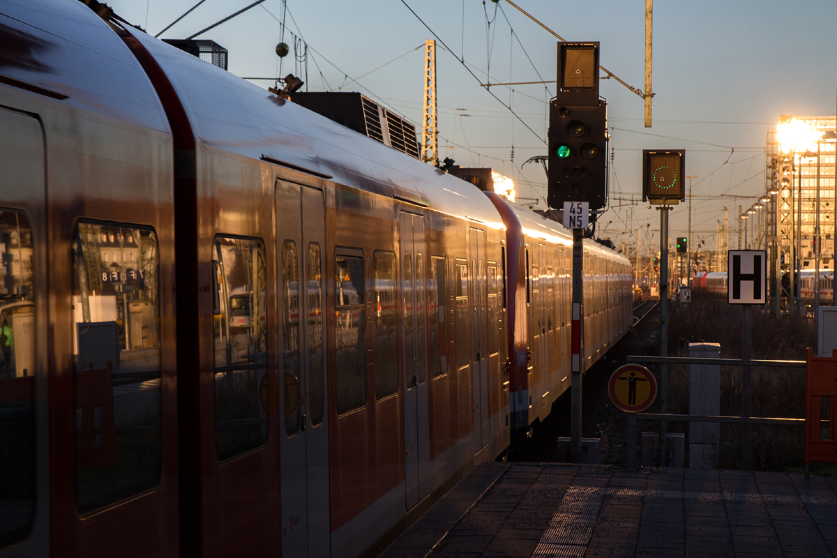 Die Sonne am frühen Abend des 26.01.16 spiegelte sich an einem Bürogebäude, als am Bahnsteig 5 des Münchner Ostbahnhofes die Ausfahrt einer S-Bahn nach Ebersberg fotografiert wurde.