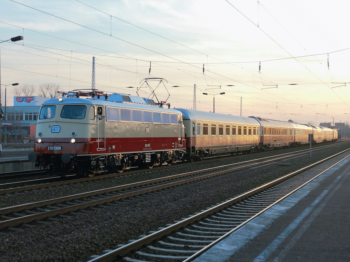 E 10 1309 bei der Ausfahrt aus dem Bahnhof Berlin Schönefeld Flughafen in Richtung Ostbahnhof am 13. Februar 2016.