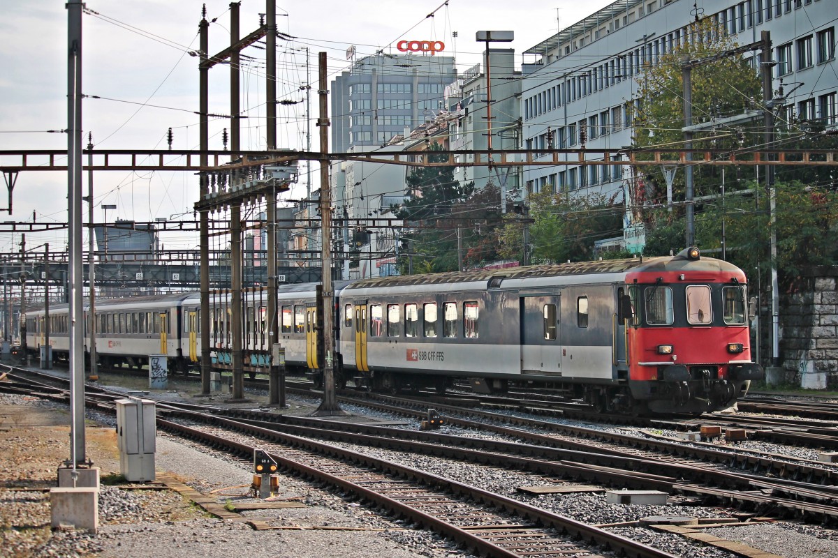 Einfahrt des Steuerwagens BDt 50 85 82-33 933-1 zusammen mit der Schublok Re 4/4 11148 am 25.10.2014 zur Bereitstellung als Extrazug in Basel SBB.