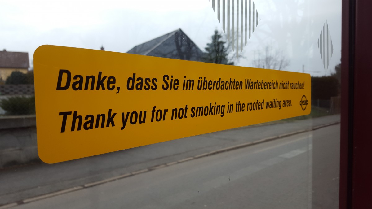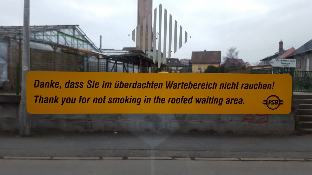 Rauchfreie Wartehäuschen! => Danke, dass Sie im überdachten Wartebereich nicht rauchen! Mit dieser Bitte wendet sich die Plauener Straßenbahn GmbH an ihre Fahrgäste und möchte jetzt für qualmfreie Wartehäuschen an den Haltestellen sorgen. | Fotoaufnahme:13.02.2016 |
