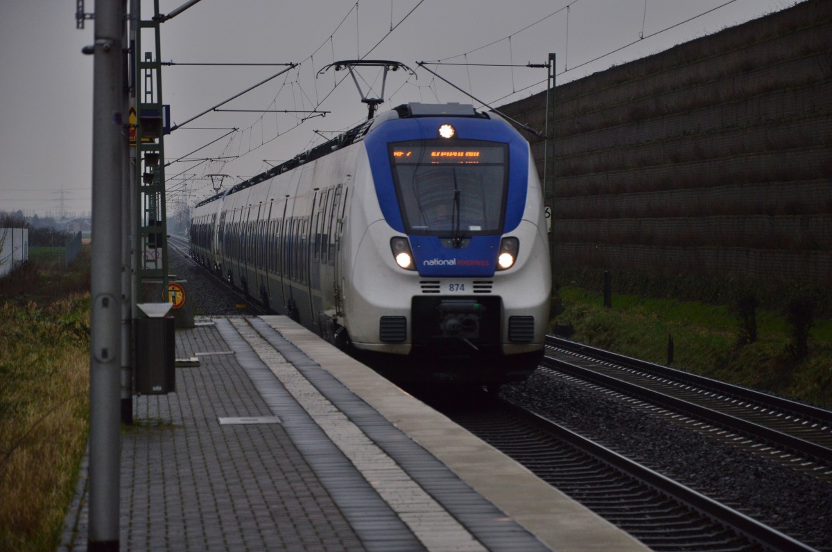 RE 26125/RE 7 nach Krefeld Hbf am Samstag den 13.2.2016. Hier ist der NX-Hamster 9442 874 im strömenden Regen bei der Durchfahrt in Allerheiligen zu sehen und das ohne Verspätung.