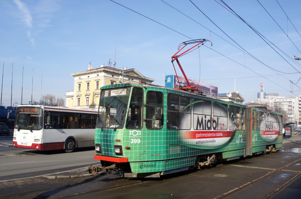 Serbien / Straßenbahn Belgrad / Tram Beograd: Tatra KT4YU - Wagen 399 der GSP Belgrad, aufgenommen im Januar 2016 am Hauptbahnhof von Belgrad.