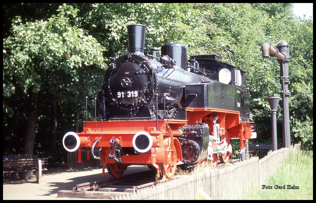 Zwei Dampflokomotiven der Georgs Marien Hütten Eisenbahn haben überlebt! Als Denkmal wurde die letzte Streckenlok der GME, Lok 5, in Münster Gremmendorf aufgestellt. MIt der Nummer 91318 steht sie heute noch immer sinnbildlich für den "Pingel Anton". Die Aufnahme entstand am9.7.1993.