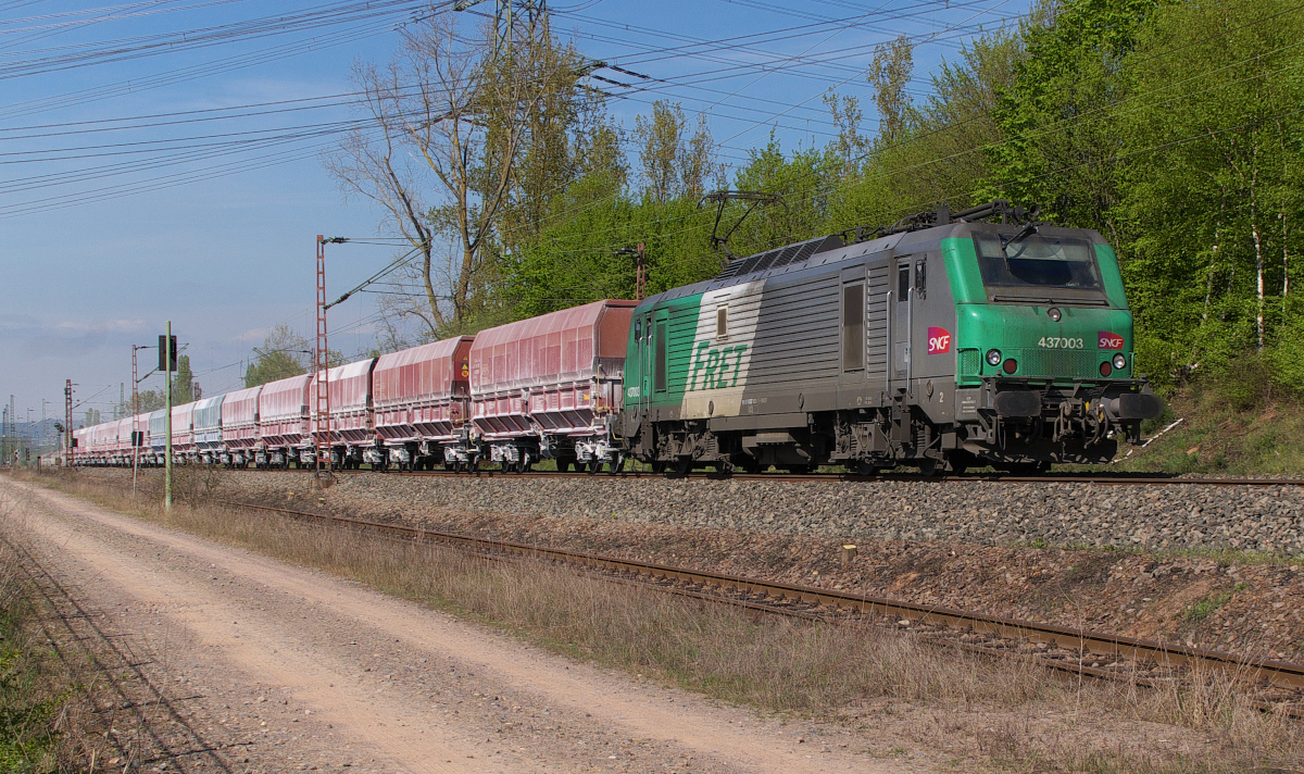 4 37003 ist schon seit einiger Zeit die Stammlok am Kalkzug aus Frankreich zur Dillinger Hütte, hier auf dem Rückweg nach Frankreich beim KW Ensdorf Saar am 10.04.2014. Bahnstrecke 3230 Saarbrücken - Karthaus