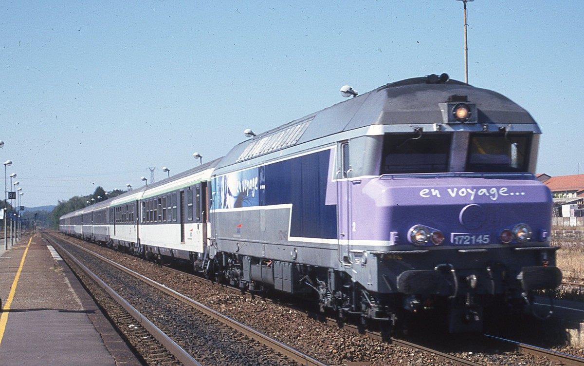 Die 172145 durchfährt mit einem IC von Paris nach Belfort den Bahnhof von Lure. Aufgenommen im September 2011. Nikon F70 - Scan vom Dia.