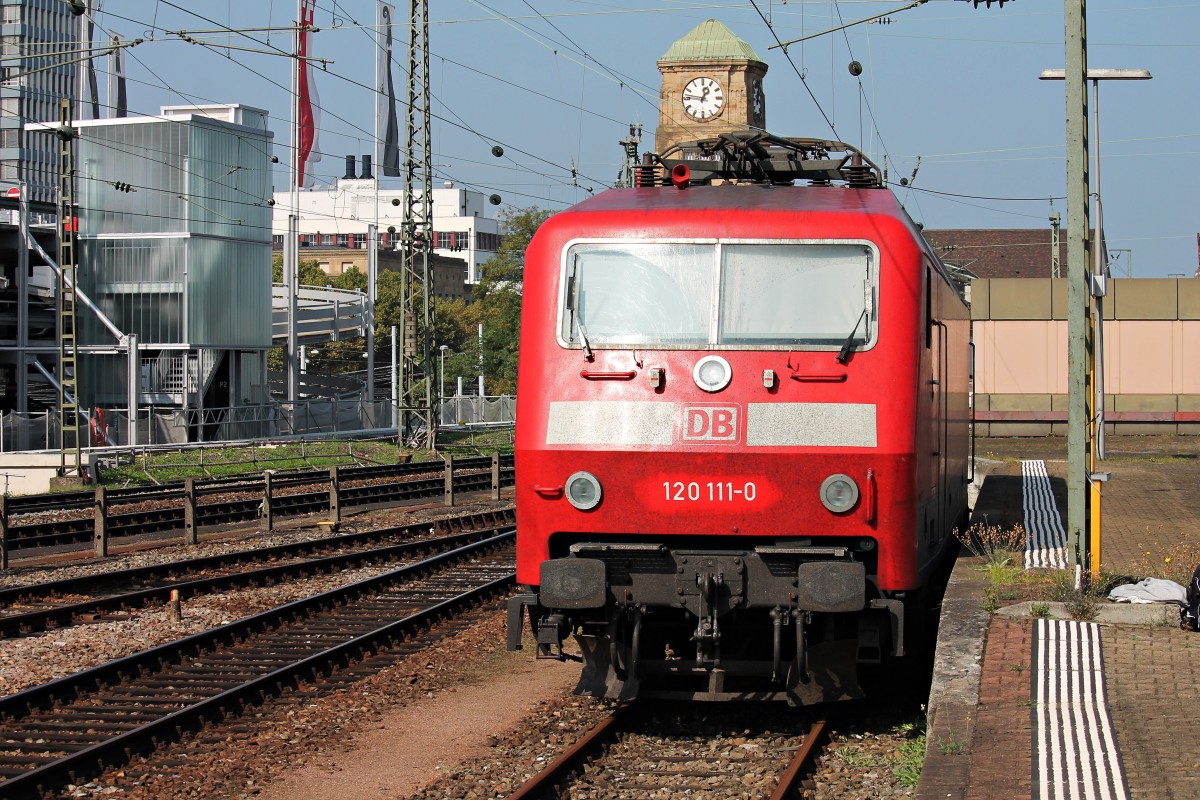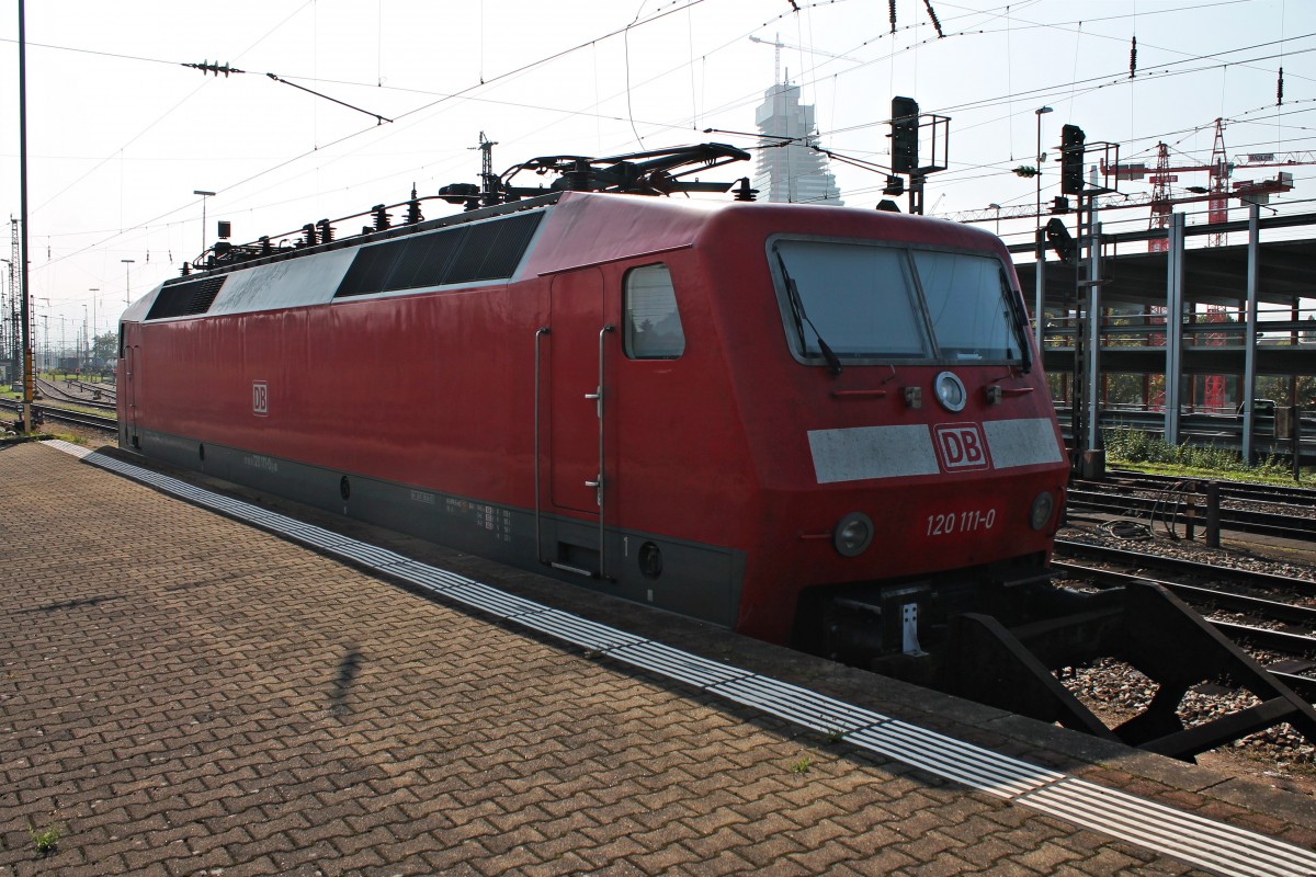 Abgestellt in Basel Bad Bf stand am 04.10.2014 die Münchner 120 111-0 auf einem Stumpfgleis und wartet auf die nächste Aufgabe.