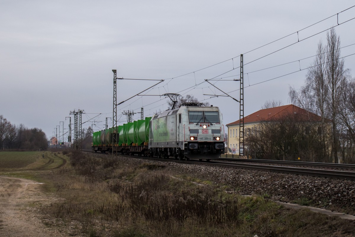 185 389 "Co2-Frei" mit einem Müllzug am 2. Januar 2016 in Regensburg-Burgweinting.