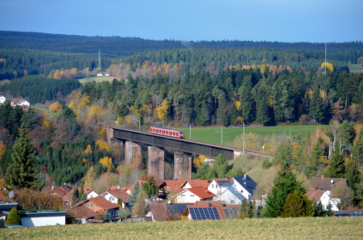 Am Vormittag des 06.11.2015 war 425 314 als RE 19585 (TS - TFS) auf dem Kübelbachviadukt über der Ortschaft Aach unterwegs in Richtung Nordschwarzwaldhauptstadt.