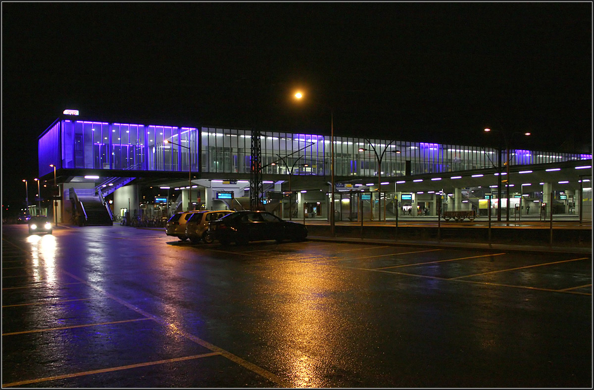 Der Heidelberger Hauptbahnhof von hinten bei Nacht. Diese Seite wird immer wichtiger, da sich hier ein großes Stadtentwicklungsgebiet befindet, die Heidelberger Bahnstadt. Noch ist von dort der Weg zum Bahnhof etwas umständlich und ich hoffe, dass die Bahnsteigbrücke noch über die Straße verlängert wird und ein direkte Weg in die Bahnstadt geschaffen wird.