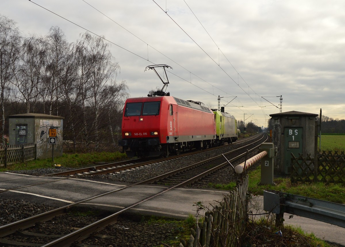 Die beiden RheinCargoloks 145-CL 015 und 119 005-6 fahren gen Krefeld am Samstag den 19.12.2015