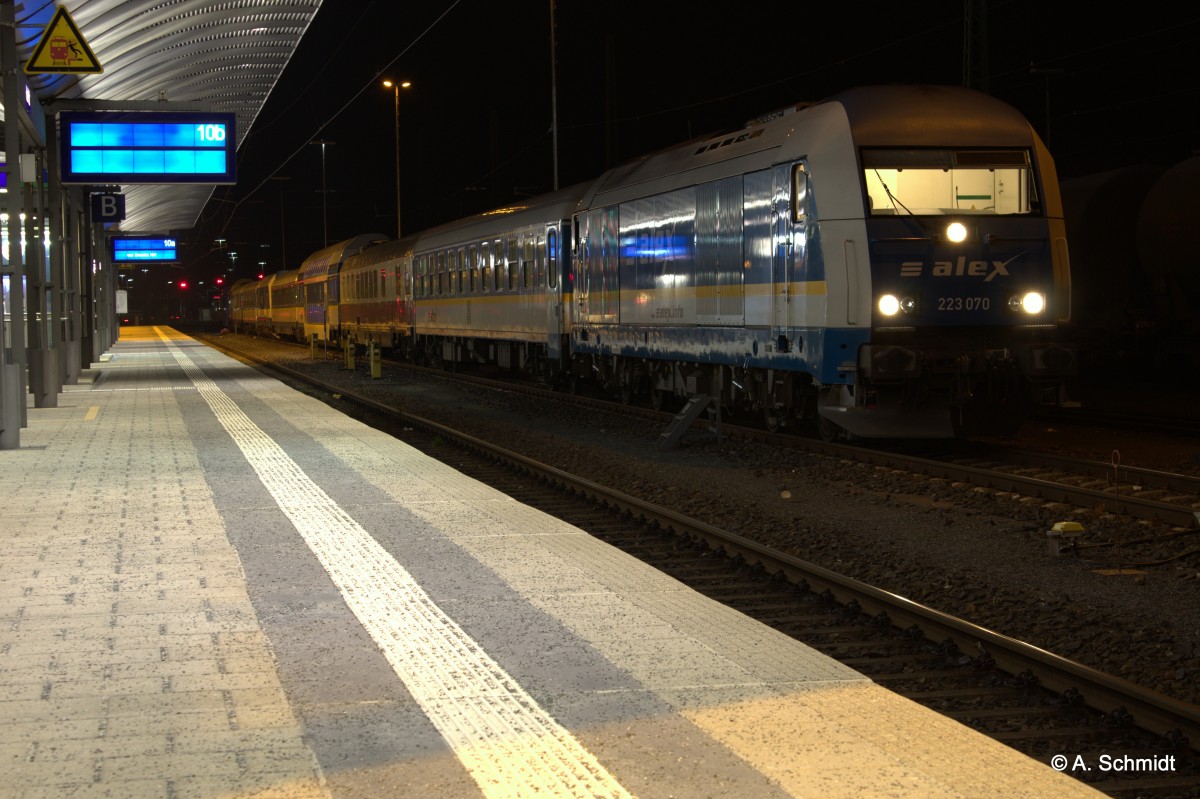 ER20, 223 070 stellt den Alex auf dem Abstellgleis ab. Aufgenommen am 29.12.2015 in Hof auf dem Hbf.