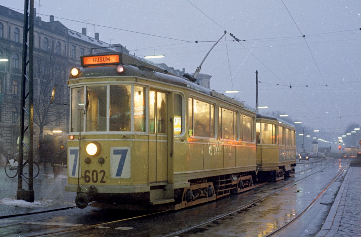 København / Kopenhagen Københavns Sporveje SL 7 (Tw 602 + Bw 15xx) Nørre Voldgade / Frederiksborggade / Nørreport station am 22. Januar 1969.