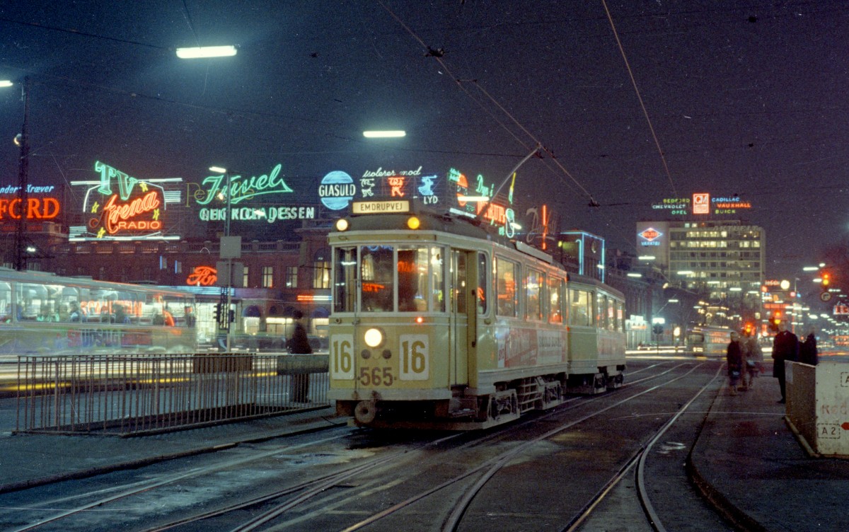 København / Kopenhagen Rådhuspladsen / Rathausplatz SL 16 (Tw 565 + Bw 15xx) am 9. Januar 1969. - Scan von einem Farbnegativ. Film: Kodacolor X.