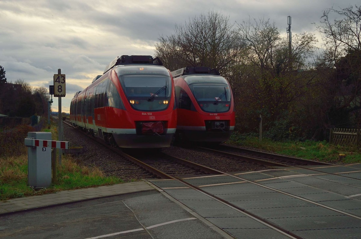 Treffen zweier RB 38 644ziger Triebzüge in Holzheim am 22.12.2015