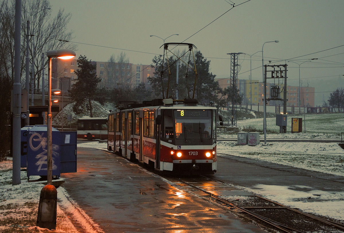 "Graue Stunde" in der Endstelle Stary Liskovec: Tw.1922 vom Typ 13T wartet in der Wendeanlage die Ausgleichszeit ab. ( 02.01.2016 )