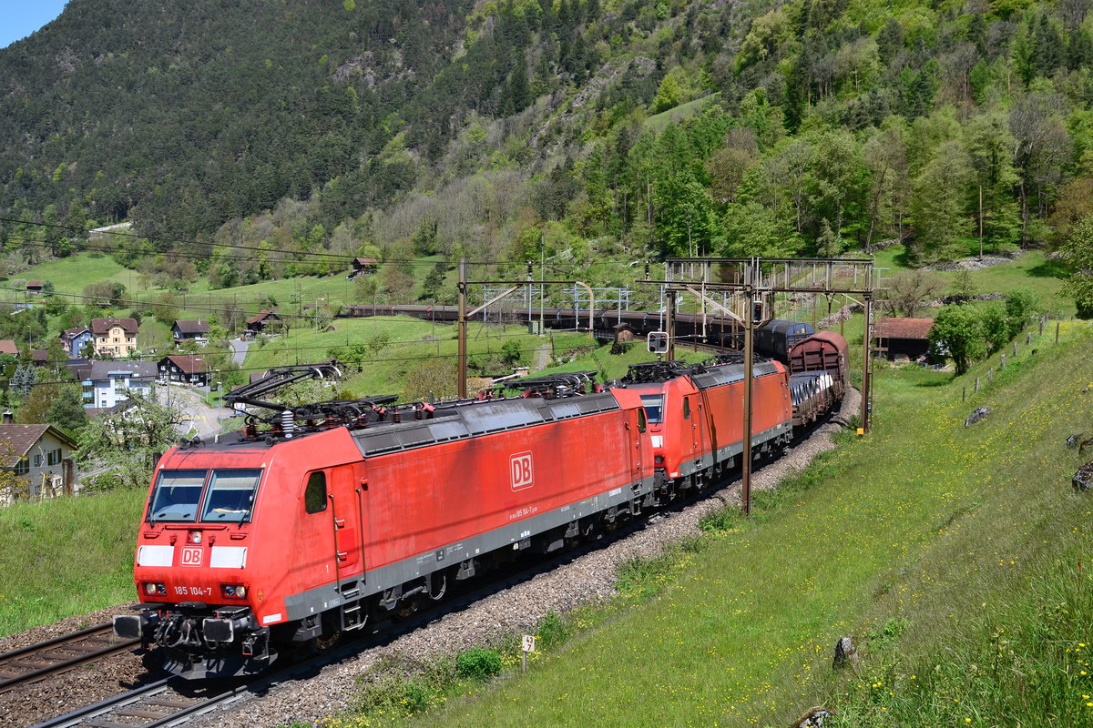 185 104 + 185 xxx mit einem schweren gemischten Güterzug am 05.05.2016 bei Silenen