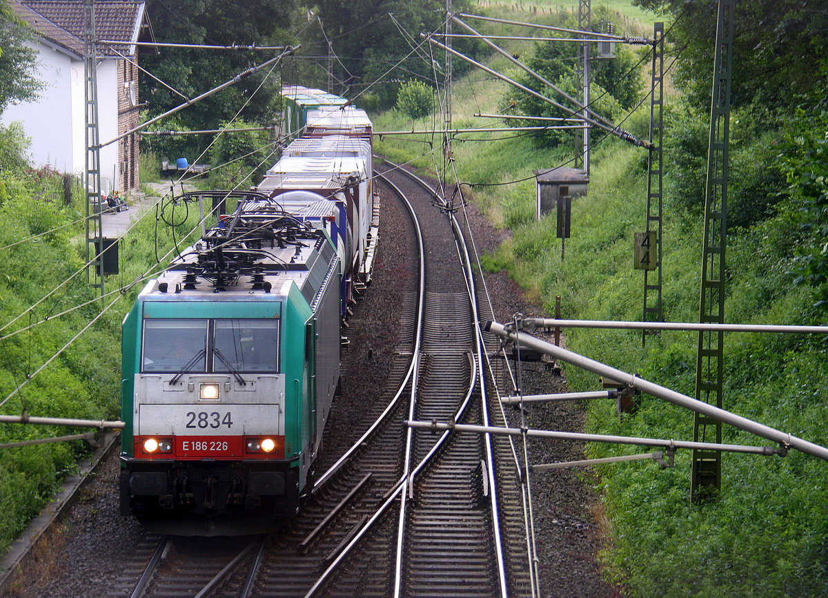 Die Cobra 2834 kommt die Gemmenicher-Rampe hochgefahren aus Aachen-West mit einem Containerzug aus Gallarate(I) nach Zeebrugge(B) und fährt gleich in den Gemmenicher-Tunnel hinein und fährt in Richtung Montzen/Vise(B).
