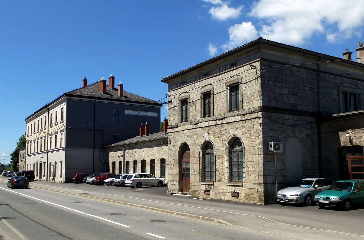 Pivka, das Bahnhofsgebäude von der Straßenseite, Juni 2016