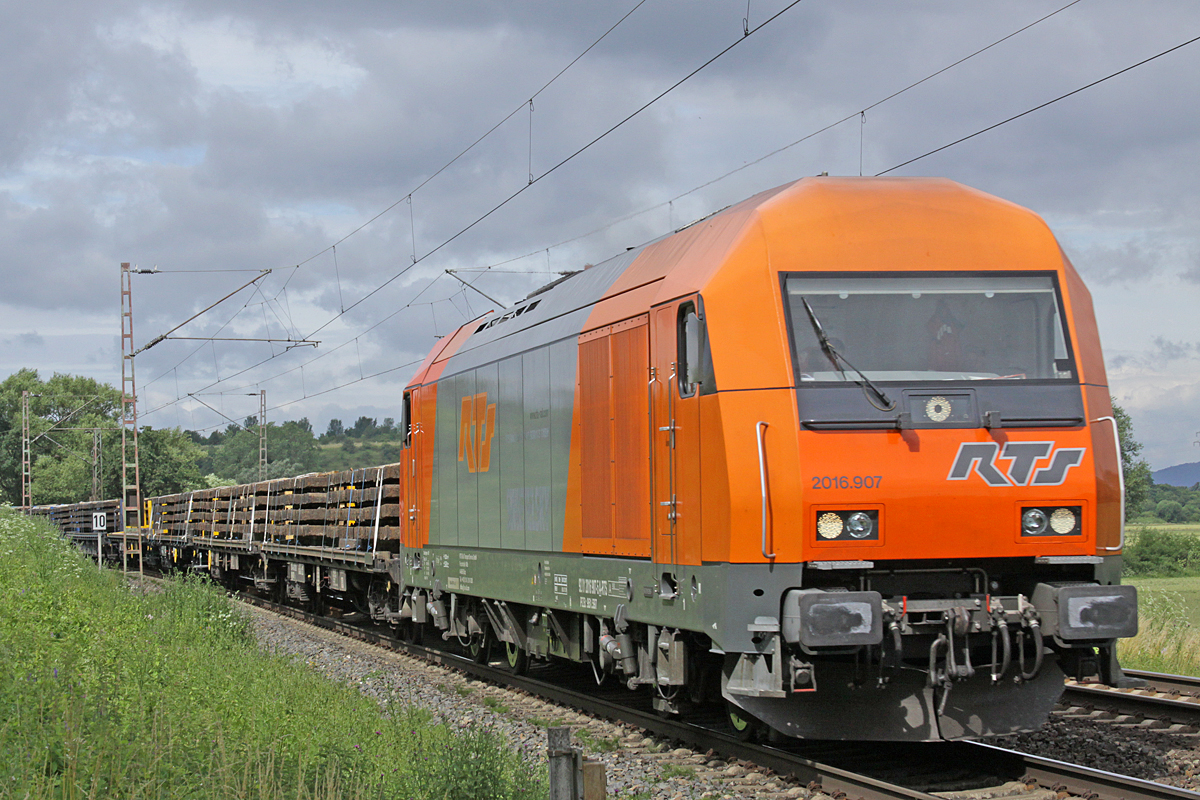 RTS 2016 907 01.07.2016 10:16 nördlich von Salzderhelden am BÜ 75,1 mit Schwellenzug in Richtung Kreiensen