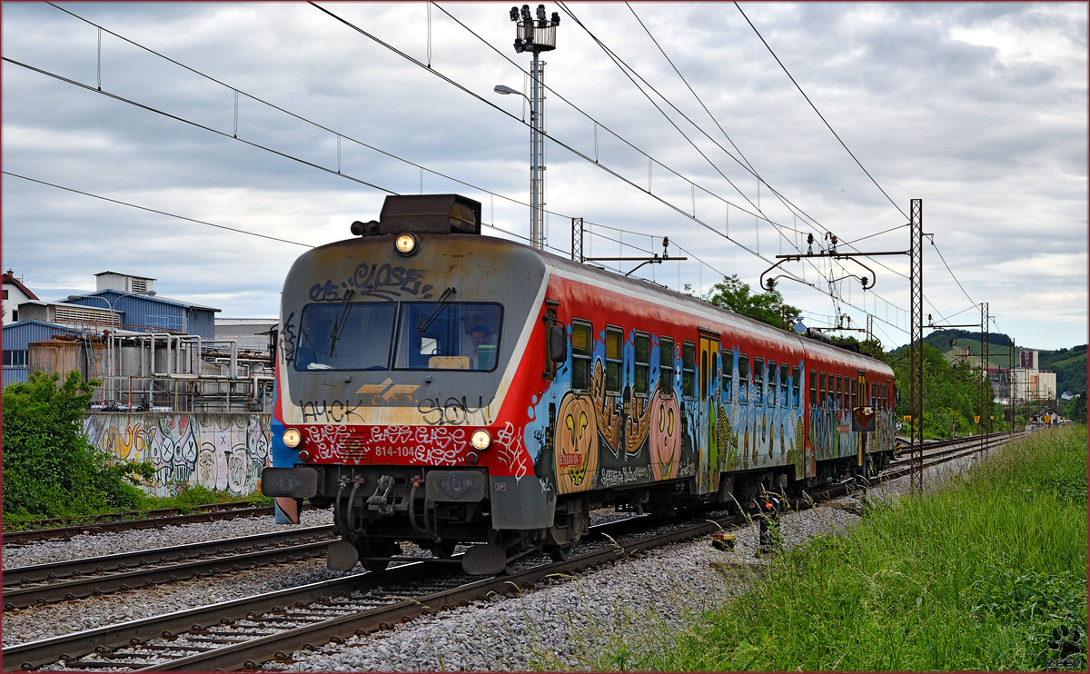 SŽ 814-104 fährt durch Maribor-Tabor Richtung Ormož. /1.6.2014