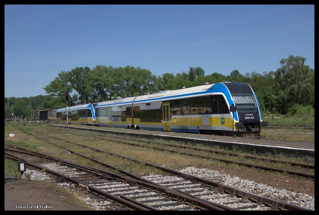 Triebwagen SA 134-012 mit weiterem SA 134 hatte am 22.05.2016 Sonntagsruhe im Bahnhof Nysa.