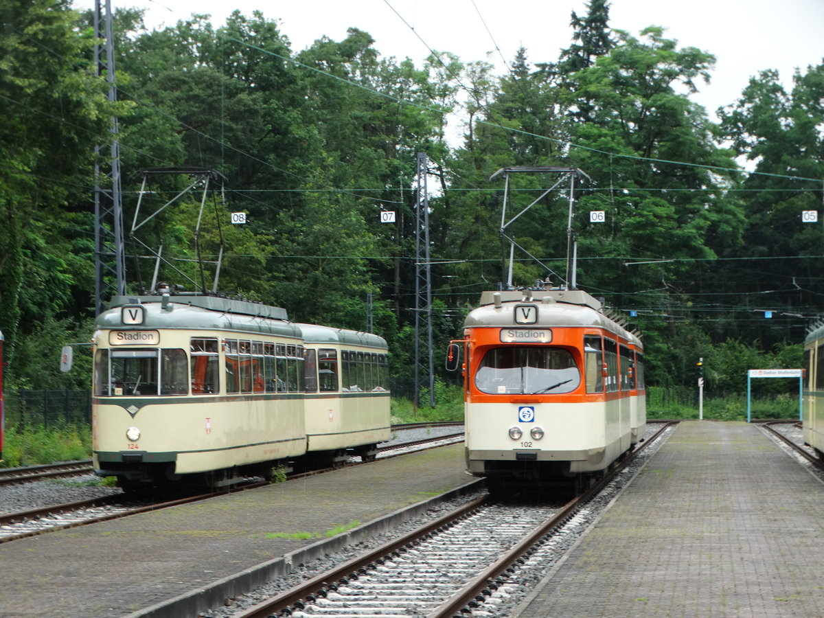 VGF Düwag L-Wagen 124 und M-Wagen 102 am 25.06.16 in Frankfurt Stadion bei der Straßenbahnparade. Die Anlage wurde für dieses Event gesperrt und mann konnte auf den Gleisen Fotos machen