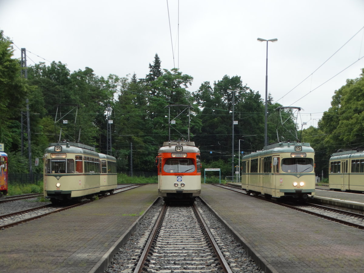 VGF L-Wagen 124, M-Wagen 102 und N-Wagen 112 am 25.06.16 in Frankfurt Stadion bei der Straßenbahnparade. Die Anlage wurde für dieses Event gesperrt und mann konnte auf den Gleisen Fotos machen