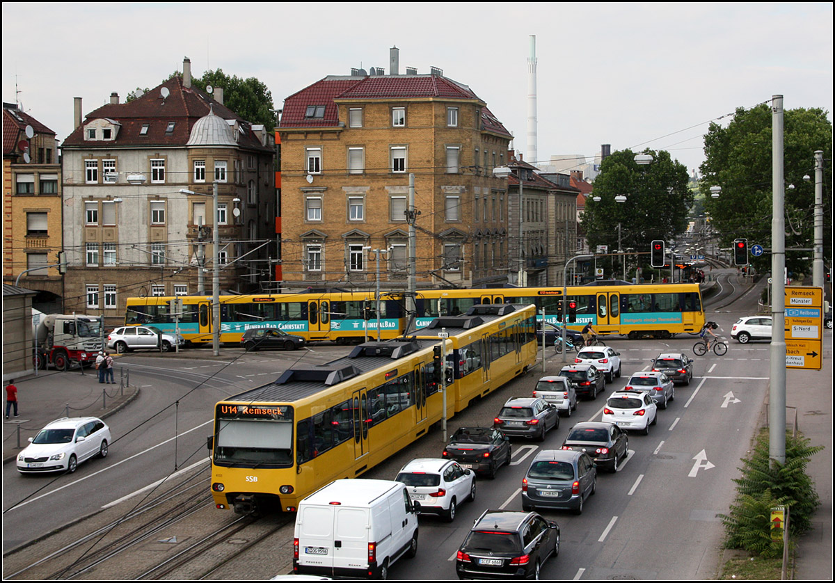 An der Haltestelle Rosensteinbrücke kreuzen sich Stadtbahnen der Linie U14 und U13. Das Umsteigen an dieser Station ist eher unbequem, es müssen Straßenfahrbahnen überquert werden. Die Haltestelle der U13 liegt links außerhalb des Bildes, die Station der U14 ist hinter hier querfahrenden U13 erkennbar.