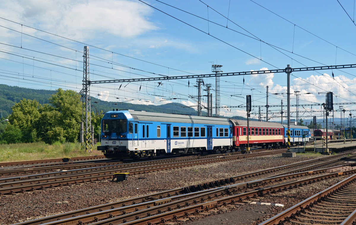 146014 war mit moderner Dosto Einheit am 25.5.2016 um 10.17 Uhr im Elbtal bei Königstein nach Bad Schandau unterwegs.