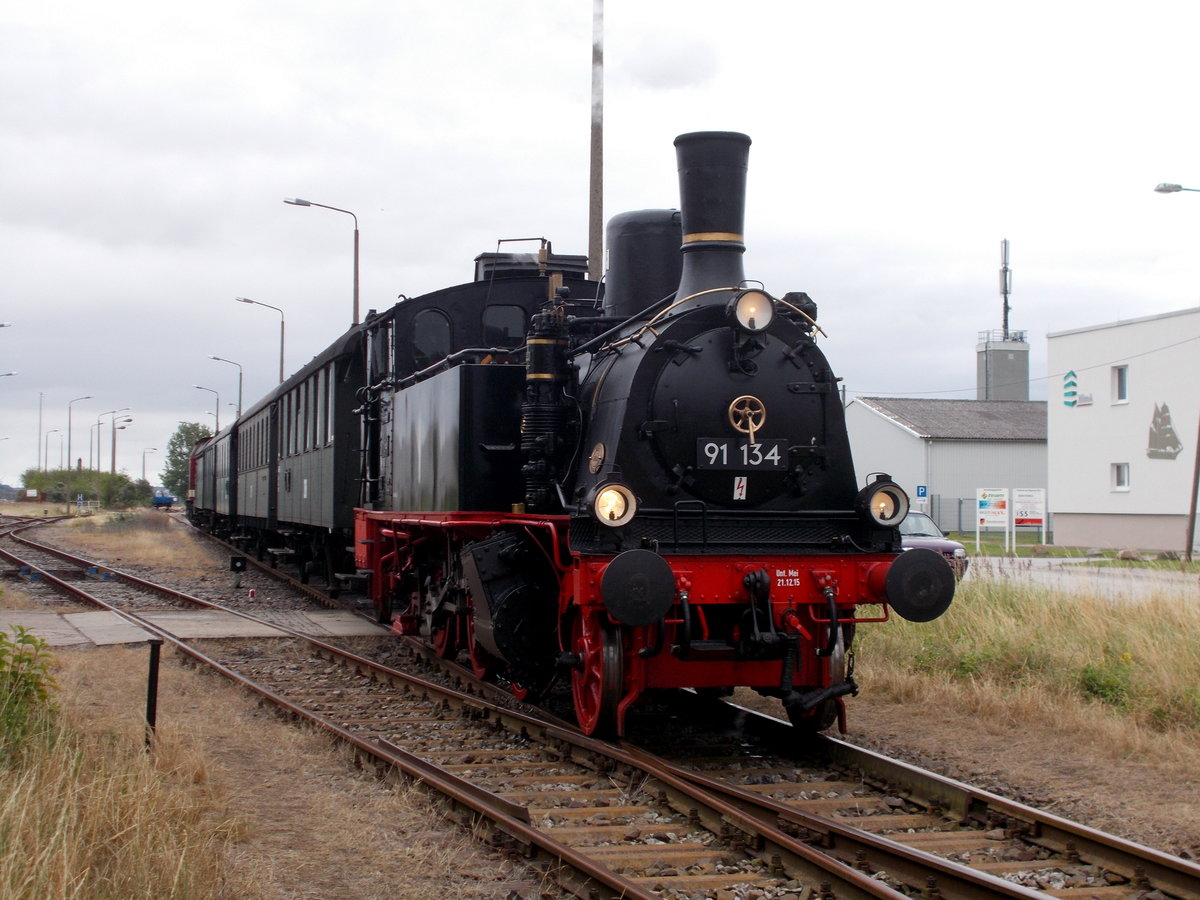 Sonderzug mit der Lok 91-134 hier zwischen Greifswald Ladebow und Museumshafen. - 16.07.2016