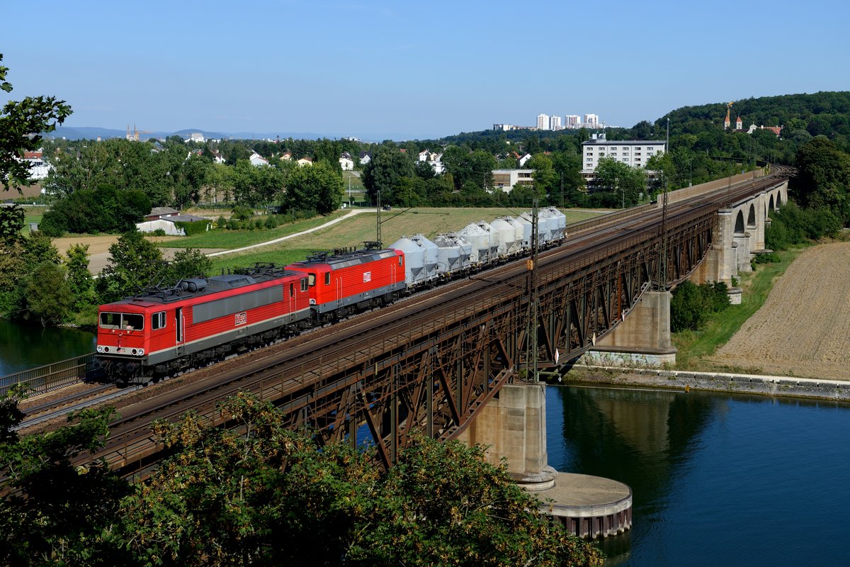 "Pfefferminz-Bonbon" 185 607 kroch mit ihrem schweren Getreide-Ganzzug über die Mariaorter Brücke bei Regensburg Prüfening und lieferte sich dabei ein Schneckenrennen mit einem Liegefahrrad-Fahrer. So sind jetzt eben beide im Bild.... (16. August 2013).