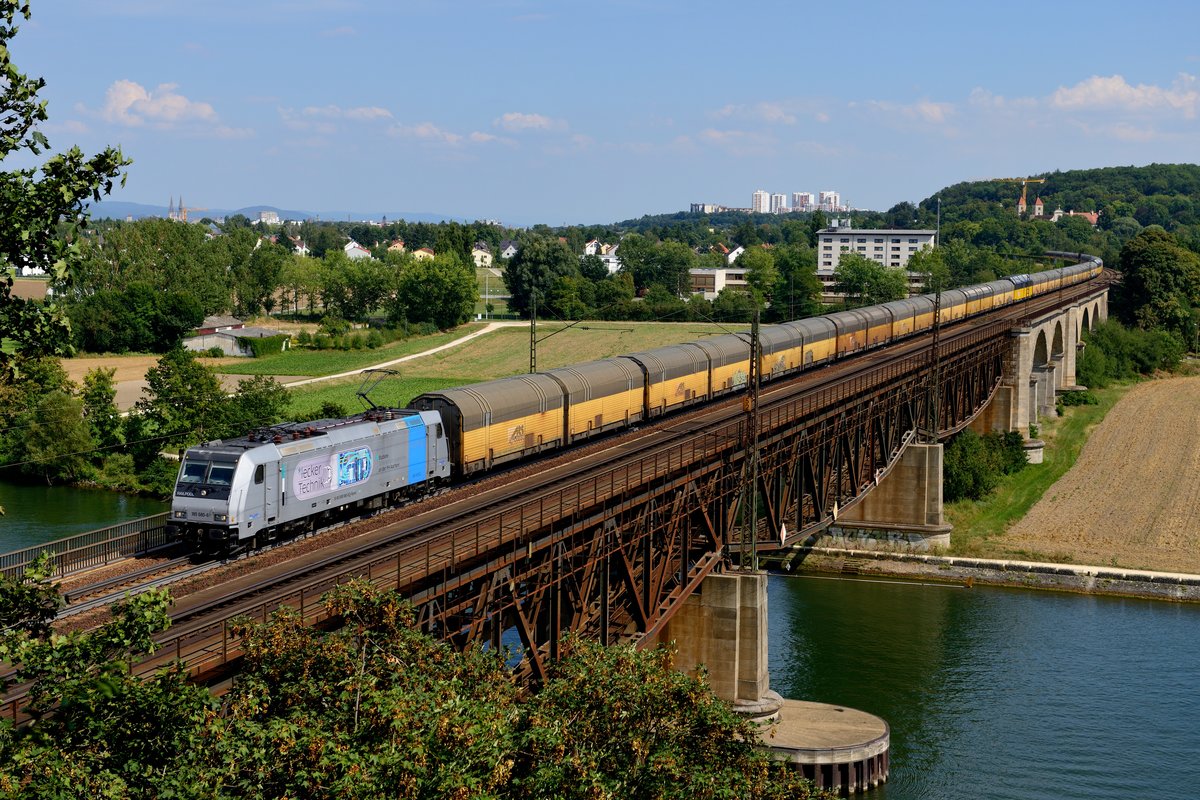 DGS 75864 von Regensburg Ost nach Bremen Rbf wurde am 17. August 2013 von der Railpool 185 680 befördert. Die Lok macht auf recht originelle Weise Werbung für ein Studium der Schienenfahrzeugtechnik an der FH Aachen. Aufgenommen wurde der Zug auf der Mariaorther Brücke in Regensburg Prüfening.