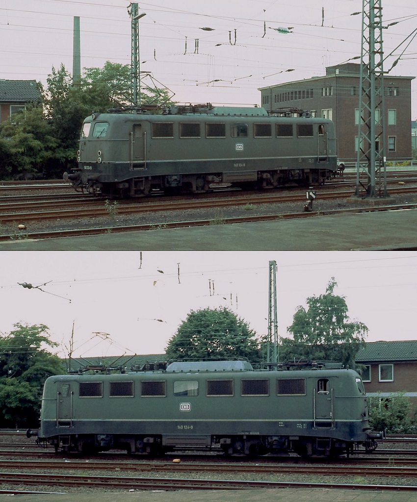 Die 140 124-9, die hier Anfang der 1980er Jahre durch den Neusser Hauptbahnhof rollt, hatte jahrelang zwei unterschiedliche Lokfronten: An der Führerstandsseite 1 Doppelscheinwerfer und an der Führerstandsseite 2 die ursprünglichen Einfachscheinwerfer